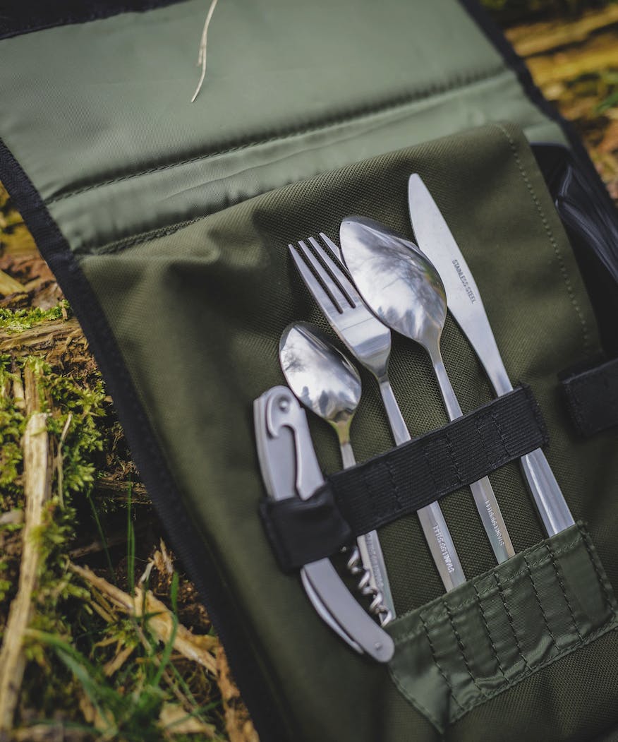 - Kompaktowy zestaw sztućców i talerzy przeznaczony dla jednej osoby