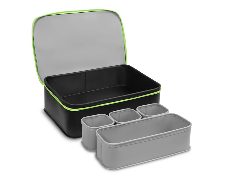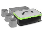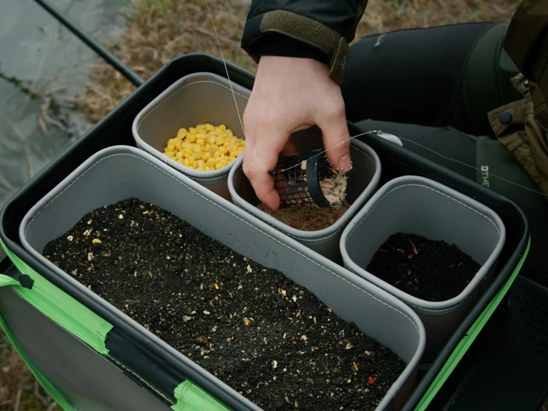 Zestaw składa się z czterech wyjmowanych pojemników, które można stosować razem lub oddzielnie. Trzy mniejsze pojemniki ułatwiają porządkowanie drobiazgów, natomiast czwarty, wydłużony, doskonale nadaje się do przechowywania gotowej zanęty. Główna komora zamykana na zamek może po wyjęciu wkładów służyć jako samodzielna torba transportowa.