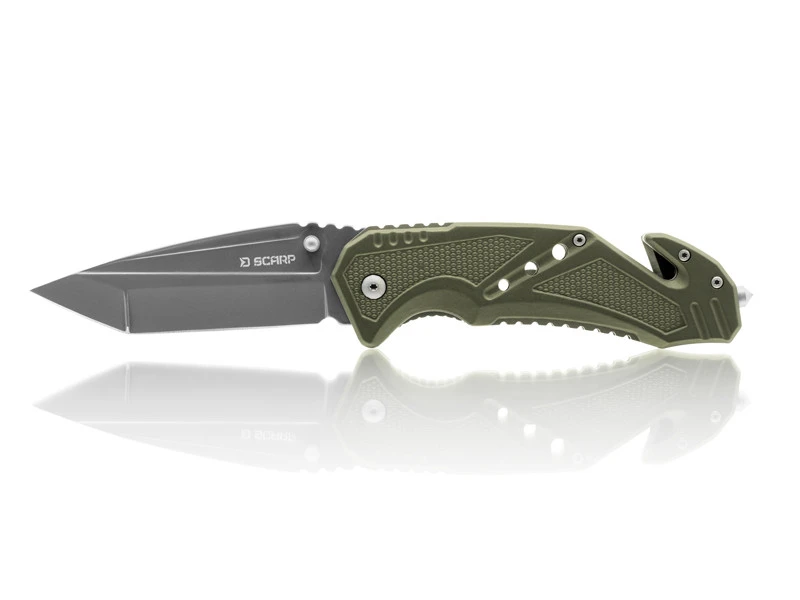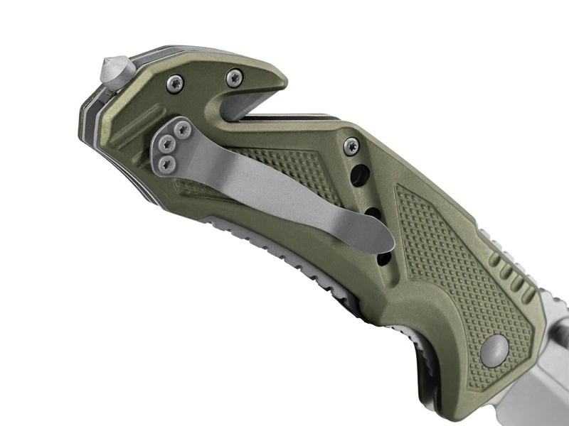 Z tyłu rękojeści znajduje się zintegrowany przecinak do lin oraz stalowy zbijak do szyb, co czyni ten model wartościowym elementem wyposażenia awaryjnego. Obustronny kołek pod kciuk umożliwia szybkie i płynne otwieranie jedną ręką.