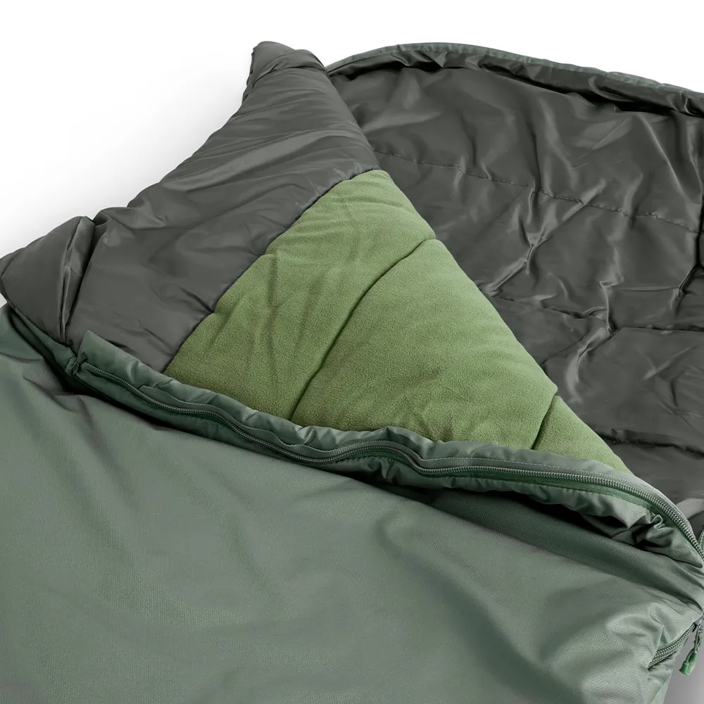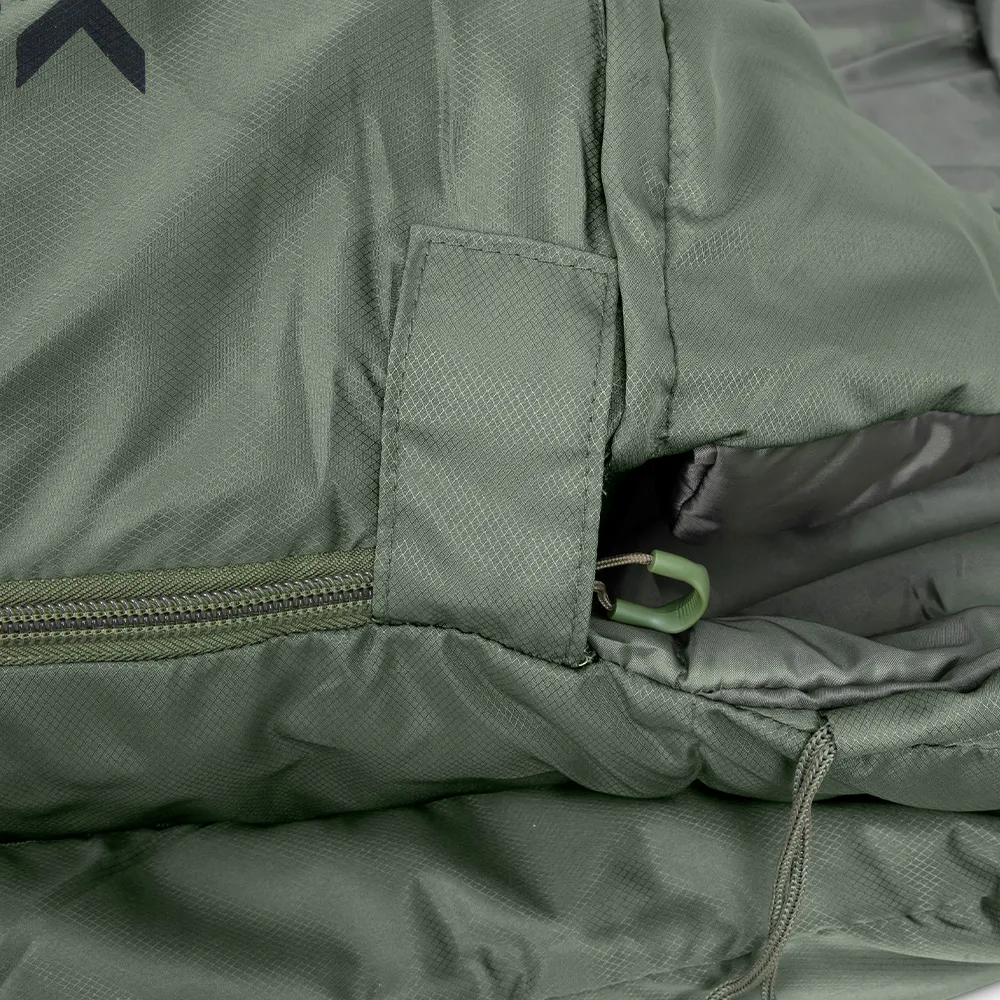 Bank-Tek 5 Season Sleep System jest cieplejszy, lżejszy i wyposażony w wiele funkcji. Wykonany jest z wodoodpornej, wytrzymałej i oddychającej tkaniny ripstop 190T. Wysokiej jakości wypełnienie z pustych włókien pokrytych silikonem utrzymuje swoją loftowość, zapewniając maksymalne zatrzymywanie ciepła. Nowa konstrukcja kaptura zapewnia maksymalną wszechstronność i pozwala na wystarczający ruch, aby śpiwóruformował się wokół Ciebie, bez względu na preferowaną pozycję do spania. Cholewka wyściełana polarem zapewnia ciepło, a gładka podstawa wyściełana poliestrem ułatwia poruszanie się wewnątrz torby. Dzięki dodatkowej, gładkiej, poliestrowej podszewce na szyję, zarówno część głowy, jak i stóp mają sznurki, które pozwalają wyeliminować zimne miejsca, zapewniając przytulny sen. Ostatnią cechą jest szeroka, rozkładana moskitiera, która bardzo przydaje się w spokojne letnie noce pod gwiazdami. Łóżko jest wykonane ze stali i aluminium na ramie o 100% płaskim profilu. Nogi są rozłożone, oferując niski profil, a każda noga ma krótką część stopy, co zapewnia dodatkową wytrzymałość i bezpieczeństwo. Nóżki są regulowane za pomocą mechanizmu nóg Grip-Lok™, co pozwala na łatwą i bezpieczną regulację wysokości. Nogi są również wzmocnione nogami z podwójnej rury, które mają duże obrotowe stopy błotne. Podwójnie składane zawiasy nadają łóżku całkowicie płaski profil i zapewniają wystarczająco dużo miejsca, aby system spania mógł się bardziej kompaktowo złożyć. Wszystkie, podkładki i mocowania mają konstrukcję ze stali nierdzewnej, co dodaje lekkości i wytrzymałości. Na końcu znajdują się dwie wygodne boczne kieszenie do przechowywania telefonu lub kluczyków samochodowych.